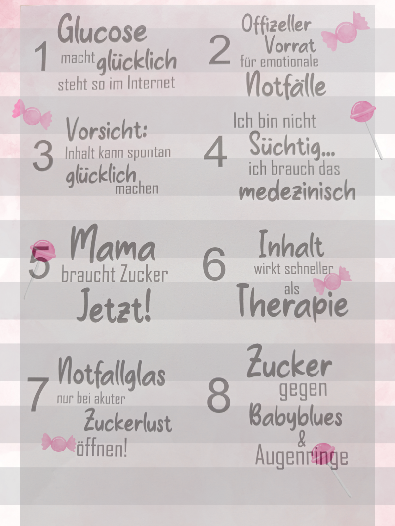 💬 Und dem Spruch: „Notfallglas – nur bei akuter Zuckerlust öffnen!“ oder einen anderen Spruch (siehe Bild)