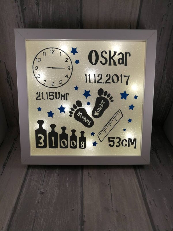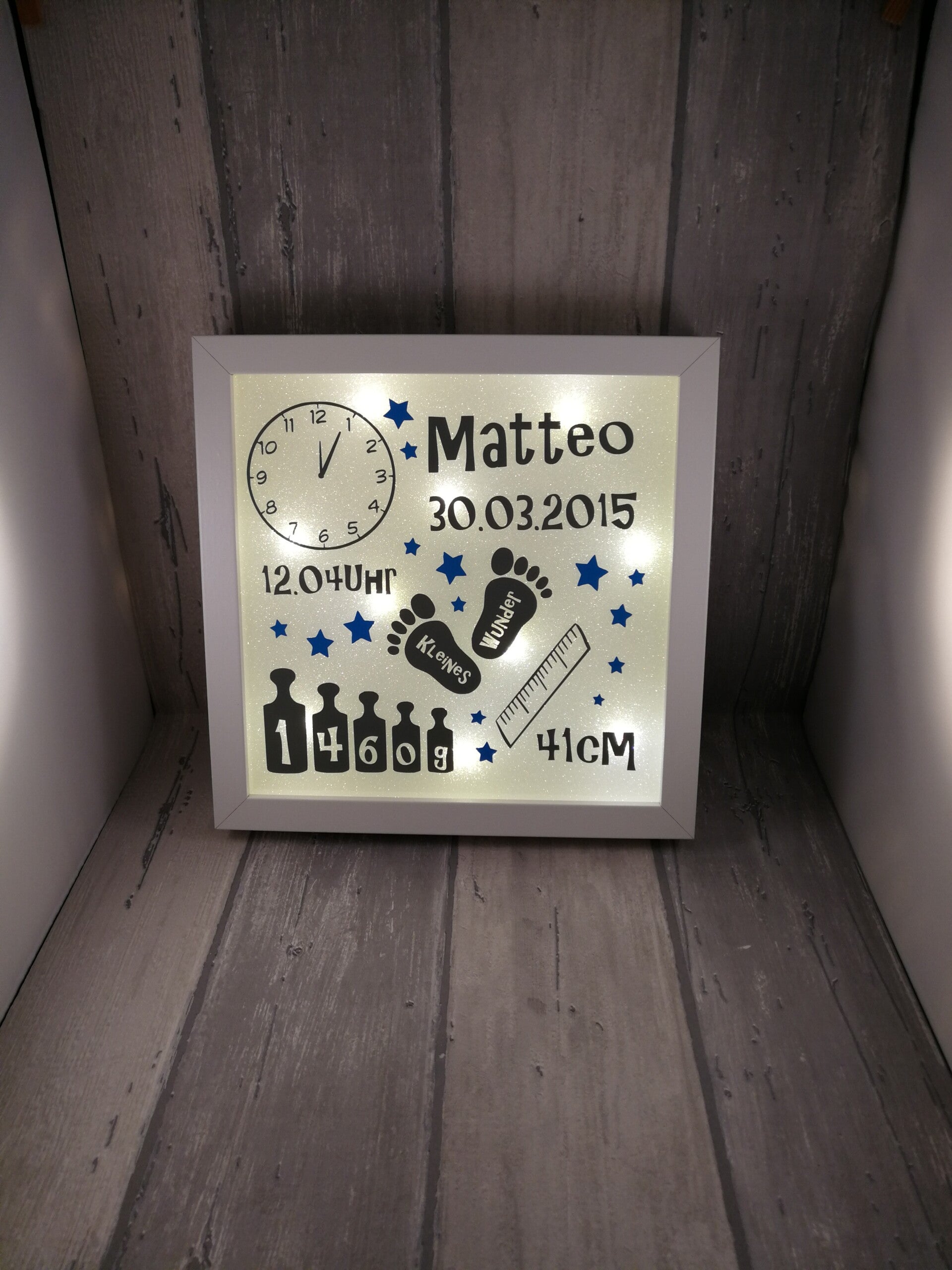Personalisiertes Babybild im Rahmen – mit LED-Beleuchtung (25x25 cm)