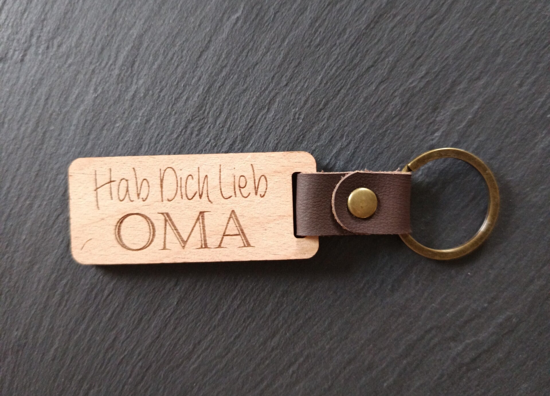 Ein ganz besonderes Geschenk mit emotionalem Wert: Dieser hochwertige Schlüsselanhänger aus Holz mit Lederband und Metallring wird auf beiden Seiten individuell graviert.